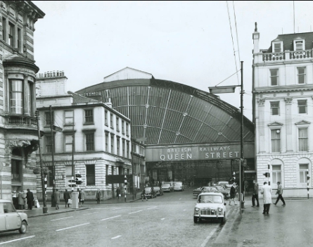 A major redevelopment is under way. The magnificent trains shed was a distinguishing feature of the station from the early days. Built across part of Queen Street the entrance was, for most of its life, very obvious from George Square.
